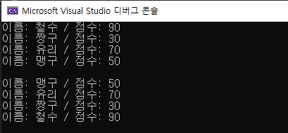 Student 클래스를 정의하면서 IComparable 인터페이스를 상속받았습니다. CompareTo() 함수는 현재 원소의 score가 다음 원소보다 작을 경우 양수를 반환하여 점수 기준 내림차순으로 정렬하게끔 만들었으며, 조건문으로 분기를 나누어 동점자일 경우에는 이름을 기준으로 정렬하도록 구현했습니다. 이 경우는 string 타입의 CompareTo()를 사용하여 오름차순(한글의 경우 가나다 순)으로 정렬되도록 했습니다. 이처럼 CompareTo() 함수를 직접 구현할 경우, 정렬 기준을 사용자가 원하는대로 고도화 시킬 수 있습니다.