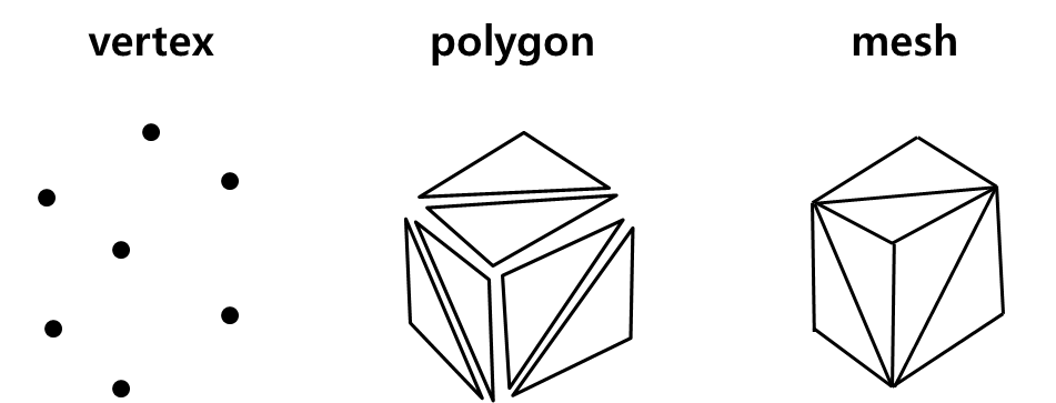 버텍스(vertex)는 삼각형을 만들기 위한 점들을 의미하며, 버텍스들을 이어서 만든 삼각형을 폴리곤(polygon)이라 합니다(사각 폴리곤도 존재합니다). 그리고 폴리곤들을 모아 특정 오브젝트의 모양을 나타낸 것을 메시(mesh)라 합니다. 버텍스 정보들은 GPU의 메모리에 저장되어 있으며, 이 버텍스 데이터는 메시의 형태만을 반영하는 로컬 스페이스(local space) 데이터입니다. 렌더링 시 해당 메시를 사용하는 오브젝트의 트랜스폼 정보를 반영하여 월드 스페이스(world space) 데이터로 변환해야 하고 이 과정을 월드 트랜스폼(world transform)이라 합니다. 또한 오브젝트를 화면에 출력할 때는 카메라를 기준으로 하며 카메라 또한 별도의 트랜스폼 정보를 가지기 때문에, 해당 데이터를 카메라에 상대적인 뷰 스페이스(view space) 데이터로 변환해야 합니다. 이 과정을 뷰 트랜스폼(view transform)이라 합니다. 해당 과정을 통해 최종적으로 오브젝트가 화면의 어느 위치에 보이게 될지 정해지며, 이러한 트랜스폼 변환은 버텍스 쉐이더(vertex shader)를 통해 처리됩니다.