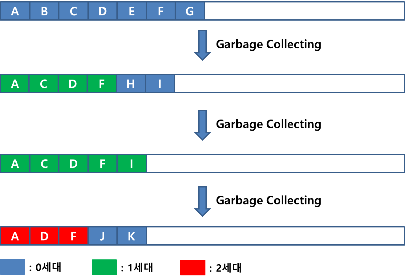 GC는 효율적인 수집을 위해 객체들에 세대를 매깁니다. 최근에 생성되어 가비지 컬렉팅을 아직 겪은 적이 없는 객체를 0세대, 가비지 컬렉팅을 1번 겪었지만 해제되지 않은 객체를 1세대, 2번 겪었지만 해제되지 않은 객체를 2세대라 합니다.