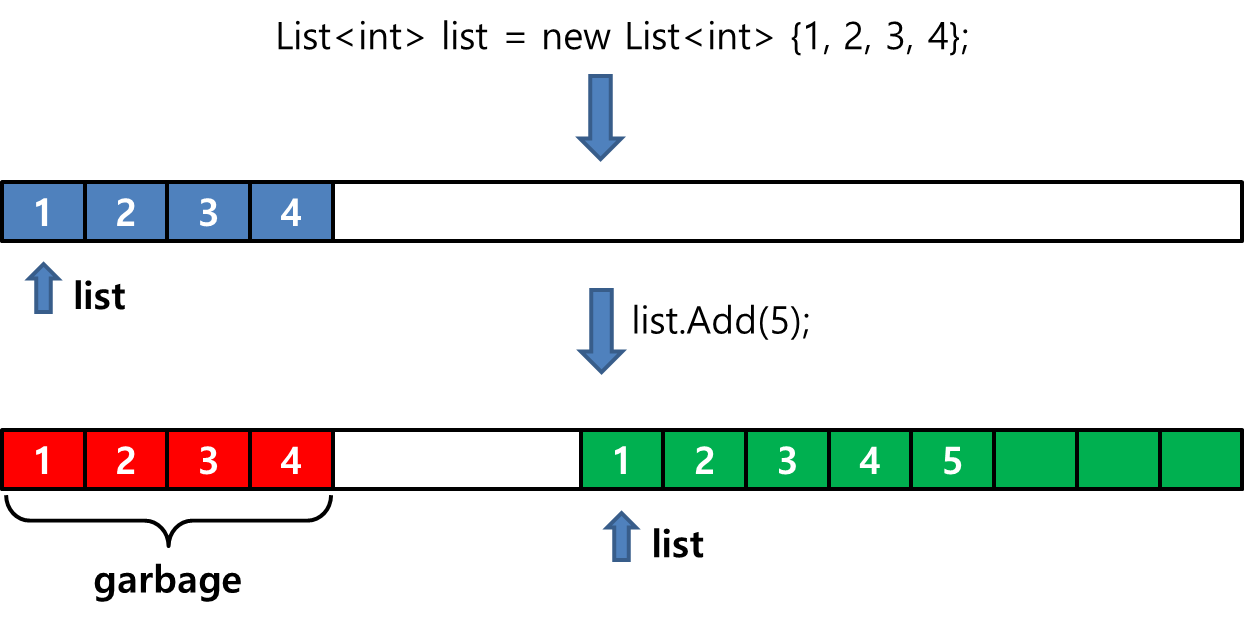 위 사진은 List에 추가적으로 원소를 삽입하는 상황을 도식화한 것입니다. List는 Add(), Remove() 등으로 원소를 자유롭게 추가, 제거할 수 있어서 항상 원소갯수만큼의 크기를 가진다고 생각할 수 있지만, 실제로는 조금 다릅니다. Capacity라는 속성 값을 살펴보면 List가 현재 저장할 수 있는 최대 원소 갯수를 나타낸다고 되어있습니다. 즉, 내부적으로는 배열처럼 고정된 크기를 가지며 그 크기를 넘어서는 추가 원소 삽입 요청 시, 사진처럼 기존 크기의 2배의 리스트를 생성한 뒤 기존 List의 값을 복사하고 추가로 원소를 삽입하는 것입니다. 이 과정이 끝나고 나면 List의 인스턴스는 당연히 새롭게 생성한 List를 가리키게 되고, 기존의 List는 아무도 참조하지 않는 가비지가 됩니다. 특히 상기 코드처럼 원소를 하나씩 추가하는 과정을 많이 반복한다면, 잦은 데이터 복사와 가비지 생성을 동시에 유발하게 됩니다. List는 분명 장점이 많은 자료구조이지만, 그만큼 단점도 있다는 점을 명심해야 합니다.