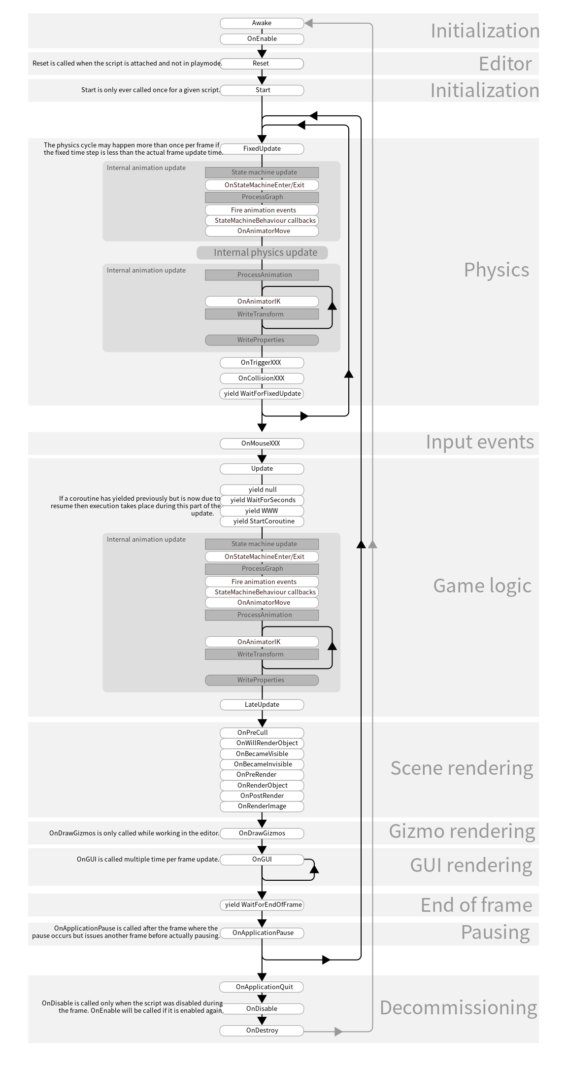 로그를 이용하여 Start()와 OnEnable()의 호출 순서를 알게 된 후 유니티 이벤트 함수들의 호출 순서를 검색하여 유니티 공식 문서에서 해당 플로우 차트를 발견하게 되었고, 그제서야 유니티의 이벤트 순서를 제대로 이해하게 되었습니다.