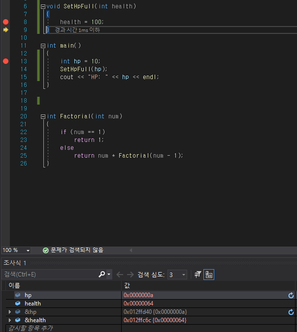 구분하기 쉽게 SetHpFull() 함수의 매개변수 이름은 health로 바꾼 뒤 실행하여 조사식에서 hp와 health의 값을 확인해보면, 각 변수의 주소와 값이 다르다는 것을 알 수 있습니다. 다음과 같이 매개변수로 포인터를 받도록 수정하면 이러한 문제를 해결할 수 있습니다.