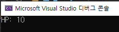 상기 C++ 코드는 int형 변수 hp를 10으로 설정한 뒤 SetHpFull() 함수의 매개변수로 전달한 뒤 hp 값을 출력하는 내용입니다. 실행해보면 초기에 설정한 10에서 변하지 않은 것을 볼 수 있습니다. 메인 함수의 지역변수와 함수의 매개변수는(이름을 동일하게 설정하여 헷갈리지만) 엄연히 다른 스택 프레임에 존재하는 별개의 변수입니다.
