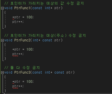 포인터에 const 사용 시 *을 기점으로 앞, 뒤에 적었을 때 그 의미가 달라집니다. const [타입]* [변수이름] 의 경우 포인터가 가리키는 대상의 값을 수정 금지한다는 뜻입니다. PtrFunc1() 함수를 보면 *ptr = 100; 에서 오류를 내고있음을 알 수 있습니다. [타입]* const [변수이름] 의 경우 포인터가 가리키는 대상, 즉 주소값을 수정 금지한다는 뜻입니다. PtrFunc2() 함수를 보면 ptr++; 에서 오류를 내고 있습니다. 둘 다 금지하고 싶을 경우에는 조금 길어지지만 양 쪽에 const 키워드를 작성하면 됩니다. PtrFunc3() 함수를 보면 둘 다 오류를 내고 있음을 알 수 있습니다.