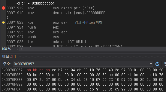 *cPtr = 0xbbbbbbbb; // 4바이트 입력