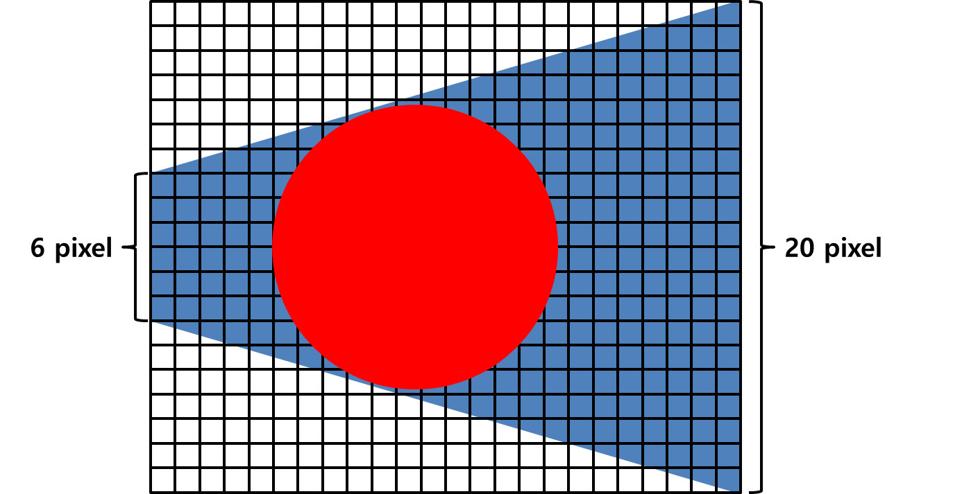 다만 쉐도우맵은 직사각형의 버퍼이므로, 프러스텀 끝부분의 픽셀 수와 앞부분의 픽셀 수가 차이나게 됩니다. 위 그림은 뷰 프러스텀 내 구체가 있는 상황을 도식화한 것으로, 위 예시에서 프러스텀 뒷부분은 20픽셀이지만 앞부분은 6픽셀밖에 되지 않습니다. 이와 같은 이유로 일반적인 쉐도우 매핑으로는 카메라와 가까울수록 그림자의 해상도가 떨어지게 됩니다. 쉐도우 맵의 전체 해상도를 높여서 해결할 수도 있지만, 이는 메모리 사용량을 크게 증가시키므로 비용이 높은 해결 방법입니다.