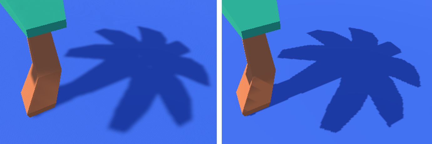 Resolution 속성으로 쉐도우 맵의 해상도를 조절할 수 있으며, 높은 해상도를 선택할수록 고품질의 그림자를 얻을 수 있습니다. 특히 Hard Shadow의 경우 해상도가 높을수록 확대하지 않고선 체감하기 어려울 정도로 계단현상이 완화됩니다. 단, 쉐도우 맵의 해상도 증가는 한마디로 버퍼의 크기 증가, 즉 메모리 사용량의 증가로 이어지므로 주의해야 합니다.