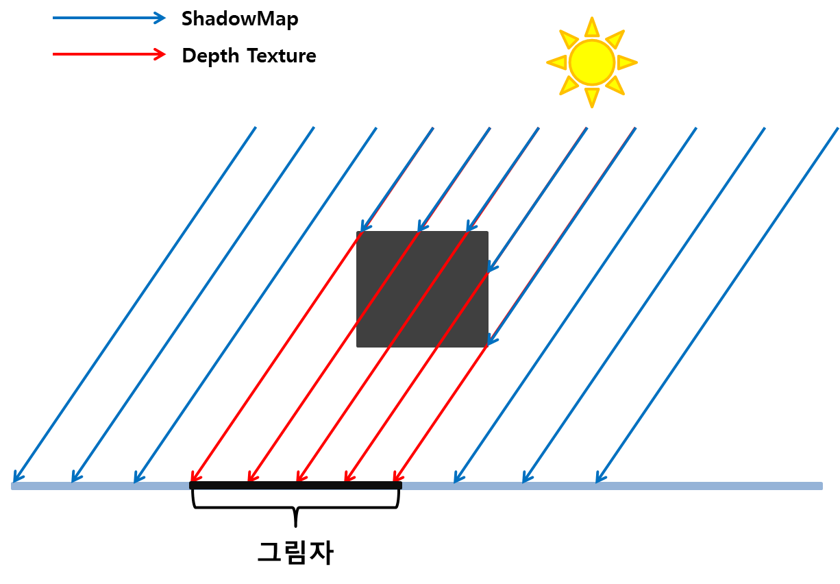여기에 추가로 광원에서 바라보는 오브젝트의 픽셀들의 깊이를 별도의 버퍼에 저장하며, 이 버퍼를 쉐도우맵이라 합니다.
