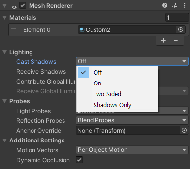 쉐도우 매핑 기법을 통해 실시간으로 그림자를 표현할 수 있지만, 성능적인 부담이 만만치 않습니다. 뎁스 텍스처와 쉐도우맵을 렌더링하기 위해 추가적인 드로우 콜이 필요하며, 화면상의 모든 픽셀에 대해 뎁스 텍스처와 쉐도우 맵의 정보를 비교, 그림자 영역을 계산하는 과정이 들어가기 때문에 픽셀 쉐이더의 부담이 늘어납니다. 따라서 이러한 실시간 그림자 처리는 CPU, GPU 모두에게 성능적인 부담을 가합니다. 우선적으로 그림자 처리가 필요 없는 오브젝트를 걸러냄으로서 드로우콜을 감소시킬 수 있습니다. 유니티의 경우 Mesh Renderer 컴포넌트에서 Cast Shadows 항목을 off로 하면 쉐도우맵 생성 시 렌더링 대상에서 제외시킬 수 있습니다.