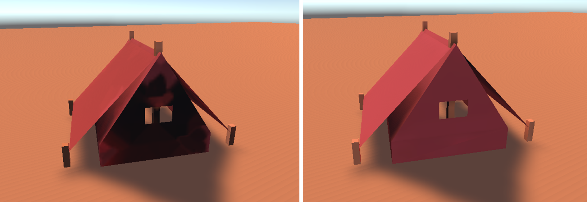해당 옵션 선택 시 그림자 영역을 별도의 텍스처로 저장하며, 이 그림자가 저장된 텍스처를 shadowmask 라고 합니다. 그림자를 따로 저장해둠으로서 런타임동안 그림자 연산을 수행하지 않고, shadowmask를 통해 그림자 여부를 판단해서 실시간 그림자와 자연스럽게 합성합니다. 따라서 Subtractive 모드와 달리 실시간 그림자와 static 오브젝트의 그림자가 자연스럽게 이어집니다(그림 5 참조). 이 옵션 또한 모바일 게임에 사용하기 적합하나, Subtractive 보다는 성능이 조금 더 요구되며 추가적인 텍스처가 만들어지기 때문에 텍스처 메모리가 추가로 요구됩니다.