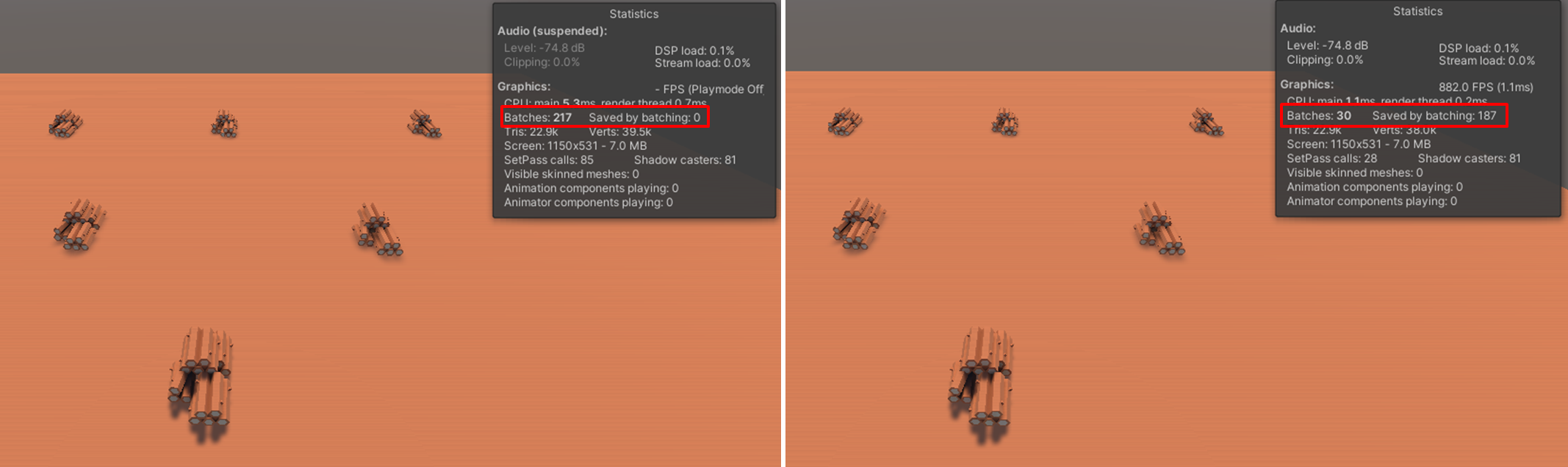 상기 사진은 다소 극단적인 비교 예시로, Lighmap Resolution이 400일때와 40일 때를 비교한 것입니다. 좌측은 무려 17장의 라이트맵이 생성되었고, 이 때문에 배칭이 전혀 이루어지지 않아 드로우콜이 무려 217회나 발생하고 있습니다. 우측은 1장의 라이트맵이 생성되어 배칭이 깨지지 않고 30회의 드로우콜로 처리되고 있는 것을 알 수 있습니다.