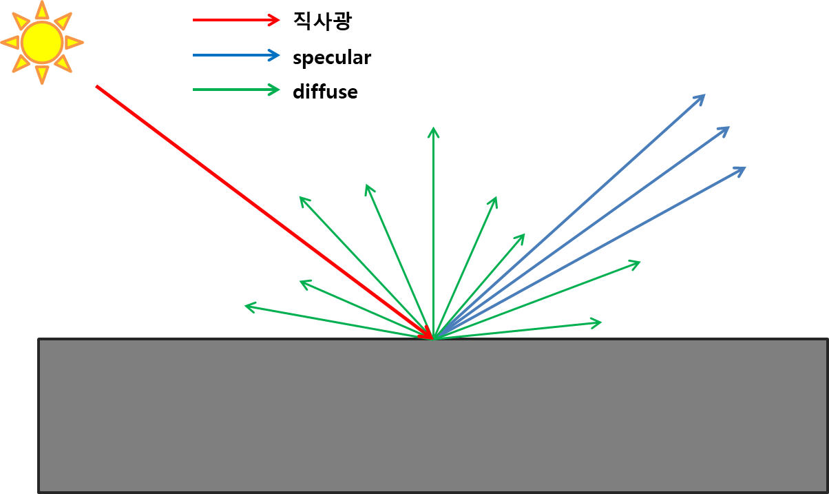 그래픽스 라이팅에서도 에너지 보존 법칙은 적용됩니다. 빛이 표면에 닿으면 빛의 일부는 표면에 흡수되었다가 산란되며, 흡수되지 않은 빛은 바로 반사됩니다. 이 때 (반사되는 빛의 양) + (산란되는 빛의 양) <= (원래 빛의 양)이 성립합니다(=은 현실에선 거의 불가능). 이 때 반사되는 빛을 스페큘러(specular), 산란되는 빛을 디퓨즈(diffuse)라고 합니다. 빛의 반사는 대상의 미세한 표면(microfacet)이 매끄러울수록 선명하게 일어나며, 거칠수록 분산됩니다.