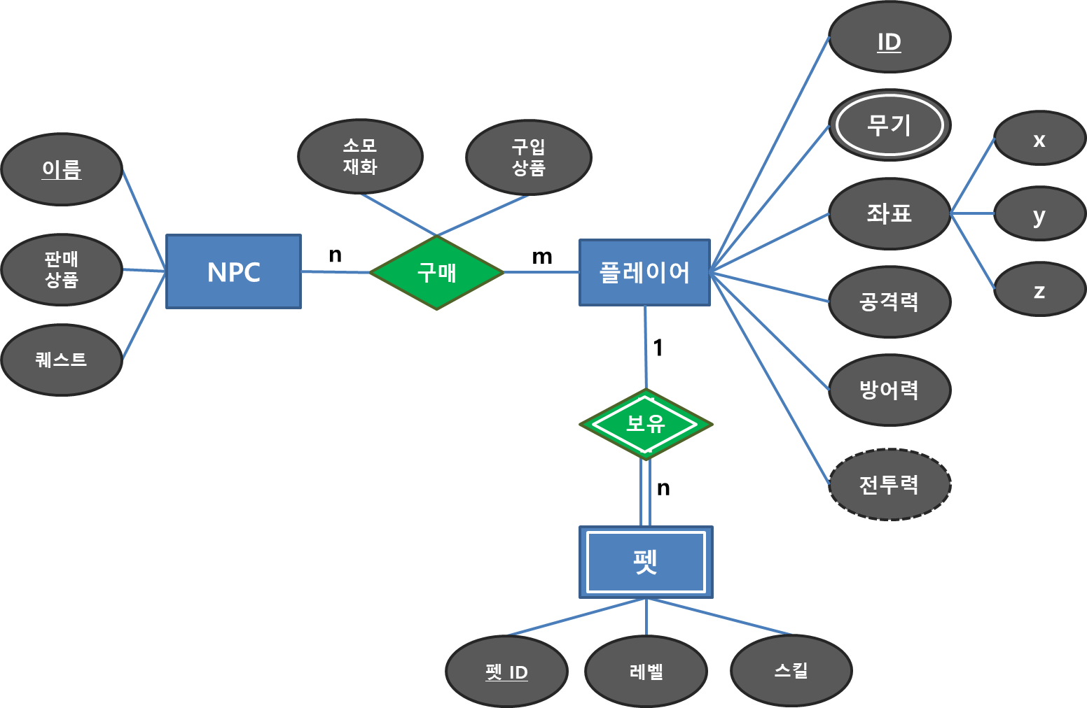 그림 9는 지금까지 소개한 내용들을 통해 게임에서 플레이어와 NPC, 플레이어와 펫의 관계를 E-R 다이어그램으로 표현한 것입니다. 플레이어는 여러명의 NPC에게서 구매할 수 있고, NPC 또한 여러명의 플레이어에게 물건을 판매하므로 해당 관계는 N:M 이며, 이 경우 E-R 다이어그램에서 연결선에 n 과 m을 표기합니다. 플레이어는 여러마리의 펫을 보유할 수 있으며, 펫은 한명의 플레이어에게만 속하므로 1:N 관계이고, 마찬가지로 연결선에 1과 n을 표기합니다. 관계 유형 외에도 위에서 언급한 키 속성, 다중 값 속성, 복합 속성 등의 표현을 포함하고 있습니다.