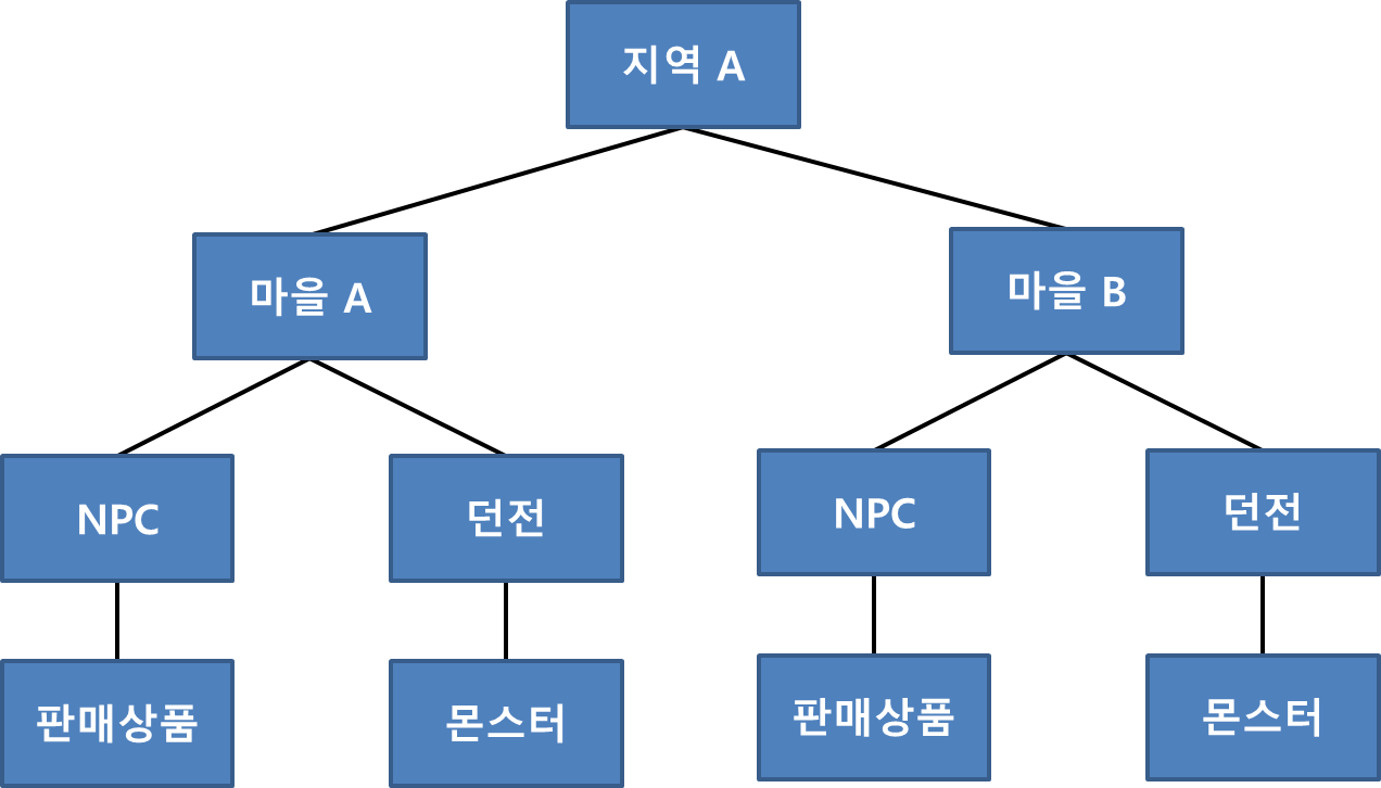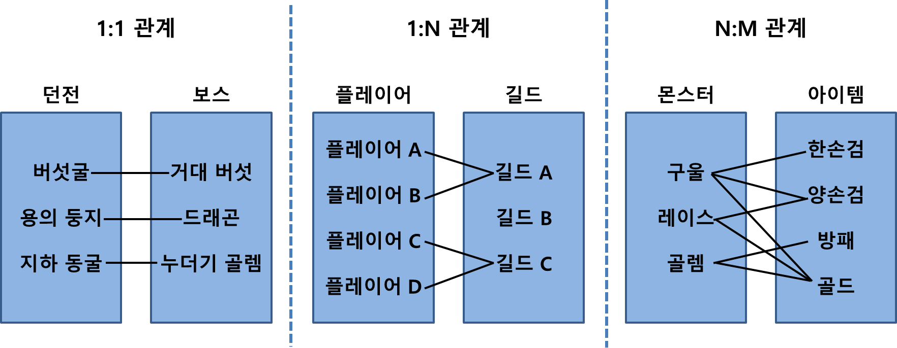 그림 6은 3가지 관계 유형에 대한 예시입니다. 각 던전마다 고유의 보스가 존재한다면, 던전과 보스의 관계는 1:1 관계가 됩니다. 플레이어는 하나의 길드에만 속할 수 있고, 한 길드에는 여러명의 플레이어가 속할 수 있으므로 플레이어와 길드의 관계는 1:N 관계입니다. 몬스터와 아이템의 드랍 관계의 경우, 한 몬스터가 여러가지 아이템을 드랍할 수 있으며 한 아이템이 여러 종류의 몬스터에게서 드랍될 수 있으므로 N:M 관계가 됩니다.
