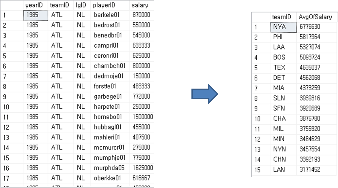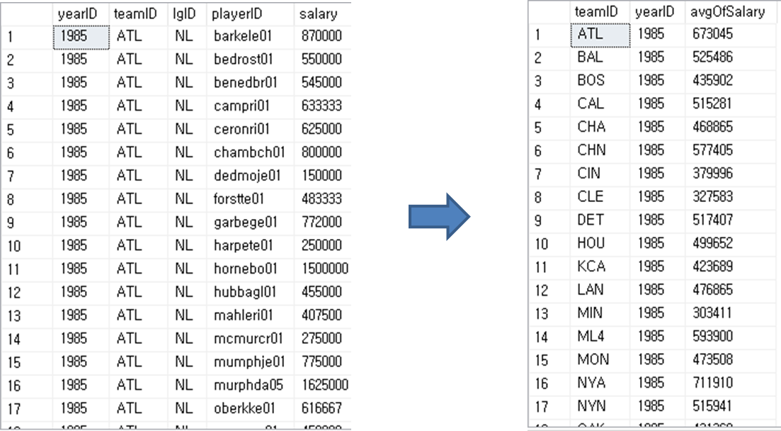 또한 GROUP BY 키워드에서 그룹화 기준을 두개 이상 설정하여 좀 더 세분화된 그룹에 집계 함수를 사용할 수도 있습니다. 예를 들어 teamID, yearID를 그룹화 기준으로 사용할 경우, '각 팀의 연도별 선수들 연봉 평균'과 같은 정보를 도출해낼 수 있습니다.
