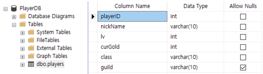 Object Explorer에서 PlayerDB의 Tables 폴더에 players 테이블이 추가된 것을 확인할 수 있습니다. 해당 테이블을 우클릭 후 Design 메뉴를 눌러보면 테이블을 구성하는 속성들의 이름, 데이터 타입, NULL 값 허용 여부 등을 확인할 수 있습니다.