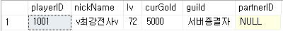 VALUES(1001, N'v최강전사v', 72, 5000, N'전사', N'서버종결자');