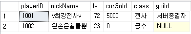 위쪽 쿼리에선 속성명을 생략하는 문법을 사용했으며, 테이블의 속성 순서와 일치하도록 모든 속성 값을 입력하였습니다. 아래쪽 쿼리에서는 입력하는 속성의 순서를 살짝 변경하였으며, 기본값이 0으로 설정된 curGold 속성과 NULL 값이 허용되는 guild 속성은 입력을 생략하였습니다. 결과를 보면 curGold, guild 속성에 기본값(0)과 NULL 값이 입력된 것을 확인할 수 있습니다.