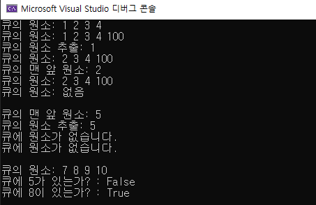 Contains() 함수는 매개변수로 전달한 값이 큐에 존재하는지 여부를 bool 값으로 반환합니다.