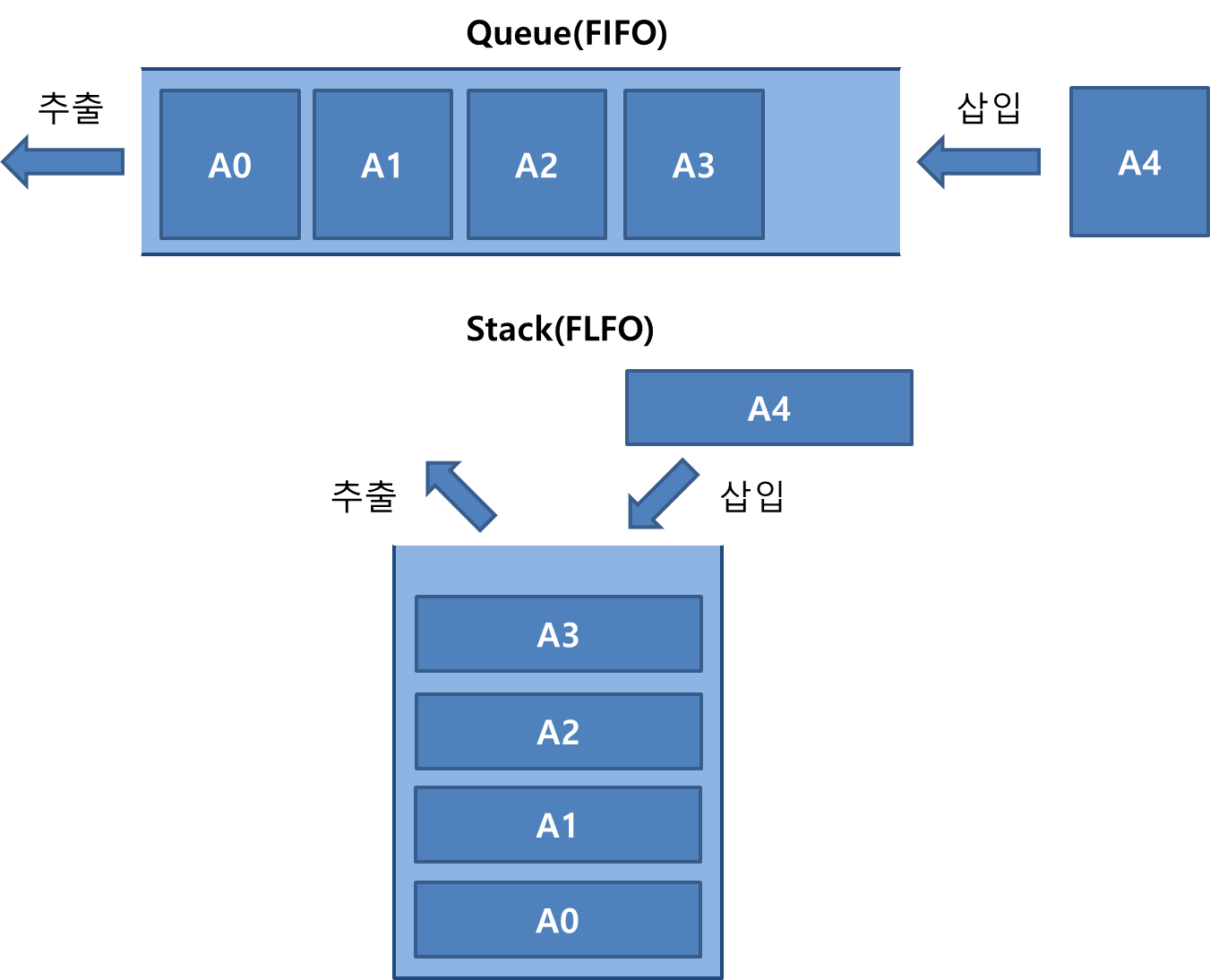 삽입하는 순서가 A0, A1, A2... 순이라면 큐는 가장 먼저 넣은 A0에만 접근할 수 있고, A0을 제거하고 나면 A1, A2, ... 순서로 접근할 수 있습니다. 스택은 반대로 가장 마지막에 넣은 A3에만 접근할 수 있고, A3를 제거하고 나면 A2, A1, ... 순서로 접근할 수 있습니다.