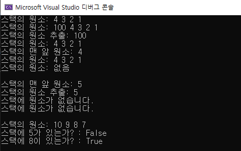 Console.WriteLine($"스택의 원소 추출: {result}");