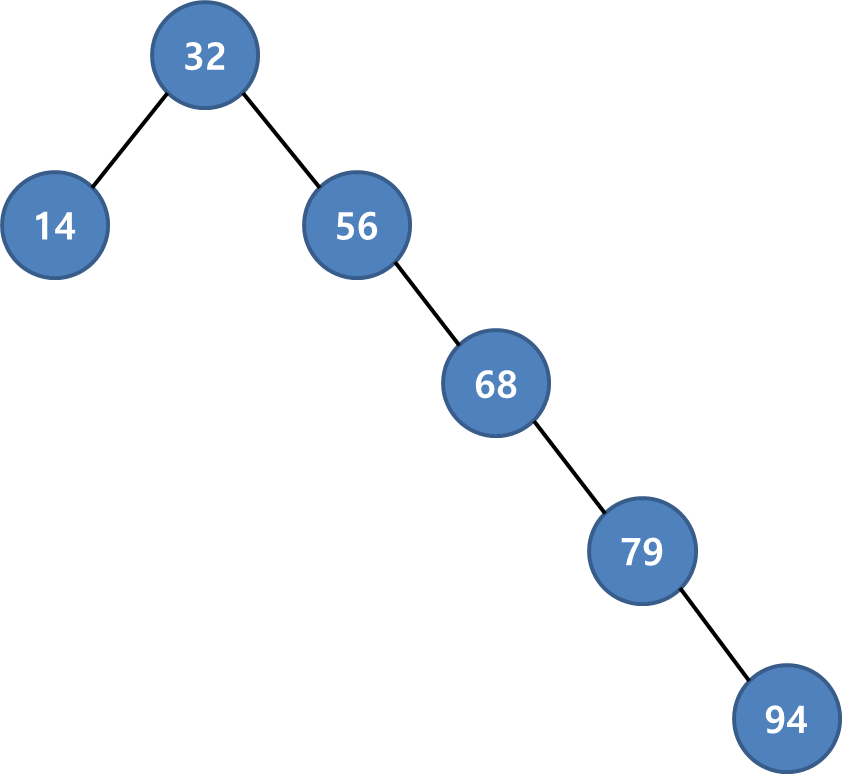 그림 3은 이진 검색 트리의 극단적으로 나쁜 예시입니다. 루트보다 낮은 값만 계속해서 들어올 경우 이렇게 트리가 심하게 편향된 구조가 되고, 이 경우 검색 효율이 O(n)에 가까워집니다. 따라서 검색 효율을 유지하려면 트리가 편향되지 않도록 재배치하는 알고리즘이 필요하고, 이를 적용한 트리로는 AVL, Red-Black 트리 등이 있습니다.