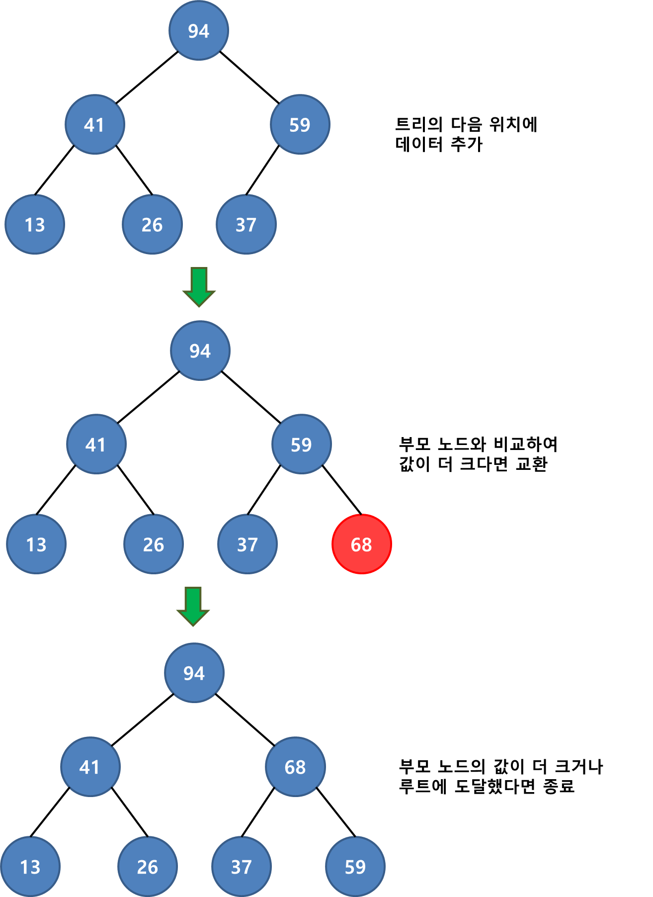 상기 과정을 통해 데이터를 추가하면 힙 트리의 구조를 유지하게 됩니다. 다음은 그림 4의 힙 트리에 새로운 값을 추가하는 예시입니다.