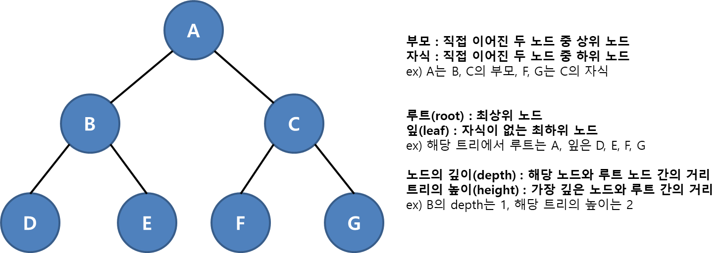트리는 계층 구조를 표현하기에 적합한 자료구조로, 노드(Node)와 간선(Edge)으로 이루어져 있습니다. 시각적으로 표현해보면 이름처럼 나무의 뿌리가 밑으로 뻗어나가는 것과 비슷한 구조를 가지게됩니다. 구조상 그래프의 일종으로 볼 수도 있으나, 계층 구조를 표현하는 만큼 순환하는 부분이 있으면 안됩니다.