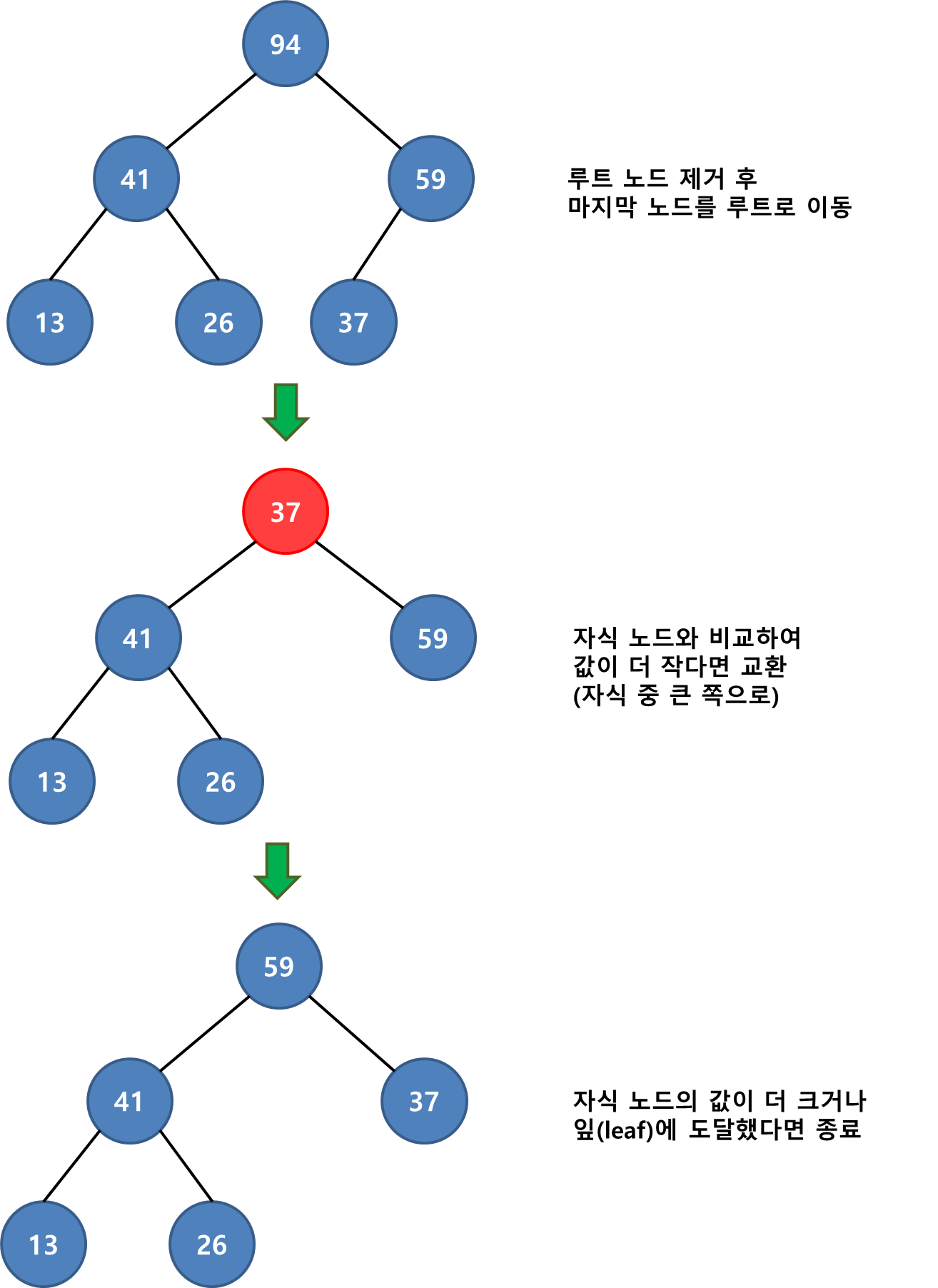 - 4) 3번 과정을 값이 더 큰 자식이 없거나 잎(leaf) 노드에 도달할 때까지 반복