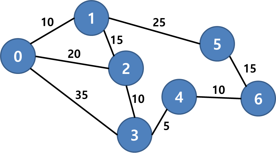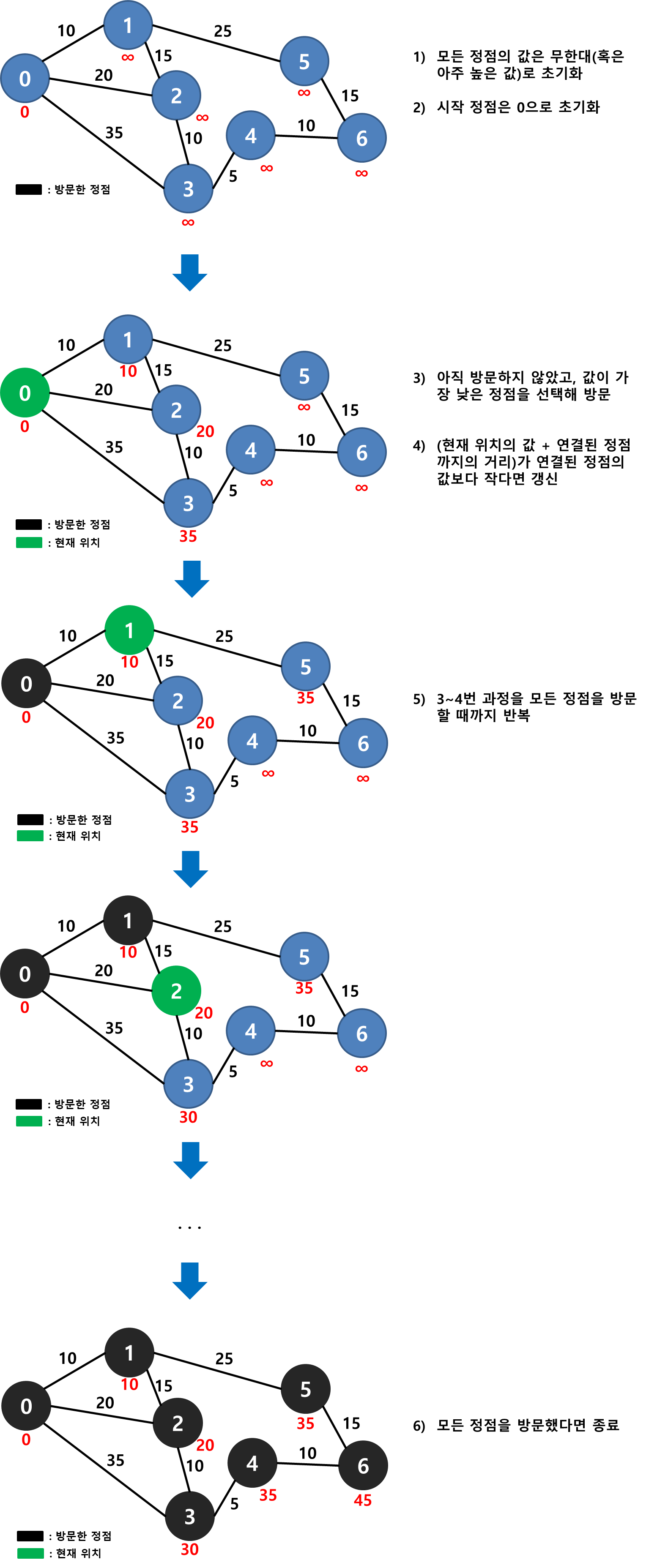 을 반복합니다. 위 예시에서는 방문한 0번 정점을 제외하고 값이 가장 낮은 1번 정점으로 이동한 후, 값 비교를 실행하여 5번 정점의 값을 35로 갱신했습니다. 2번 정점의 경우 현재 위치의 값 + 해당 정점까지의 거리(10 + 15)보다 이미 저장된 값(20)이 더 작으므로 갱신하지 않습니다. 해당 과정을 반복하여 모든 정점을 방문하고 나면 각 정점에 저장된 값이 시작점(0번 정점)부터의 최단거리가 됩니다.