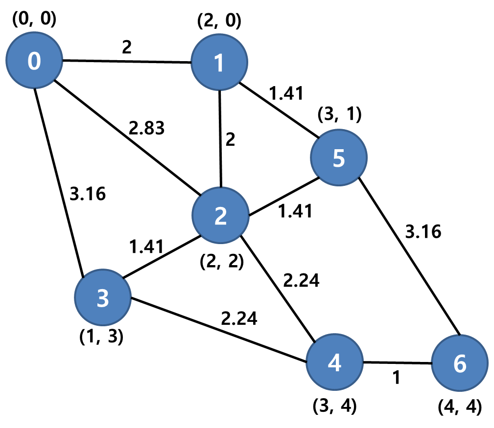 사진1의 결과를 보면 그림2의 예시와 같이 0 > 2 > 4 > 6번 순으로 방문하며, 6.07의 비용을 출력함을 확인할 수 있습니다.