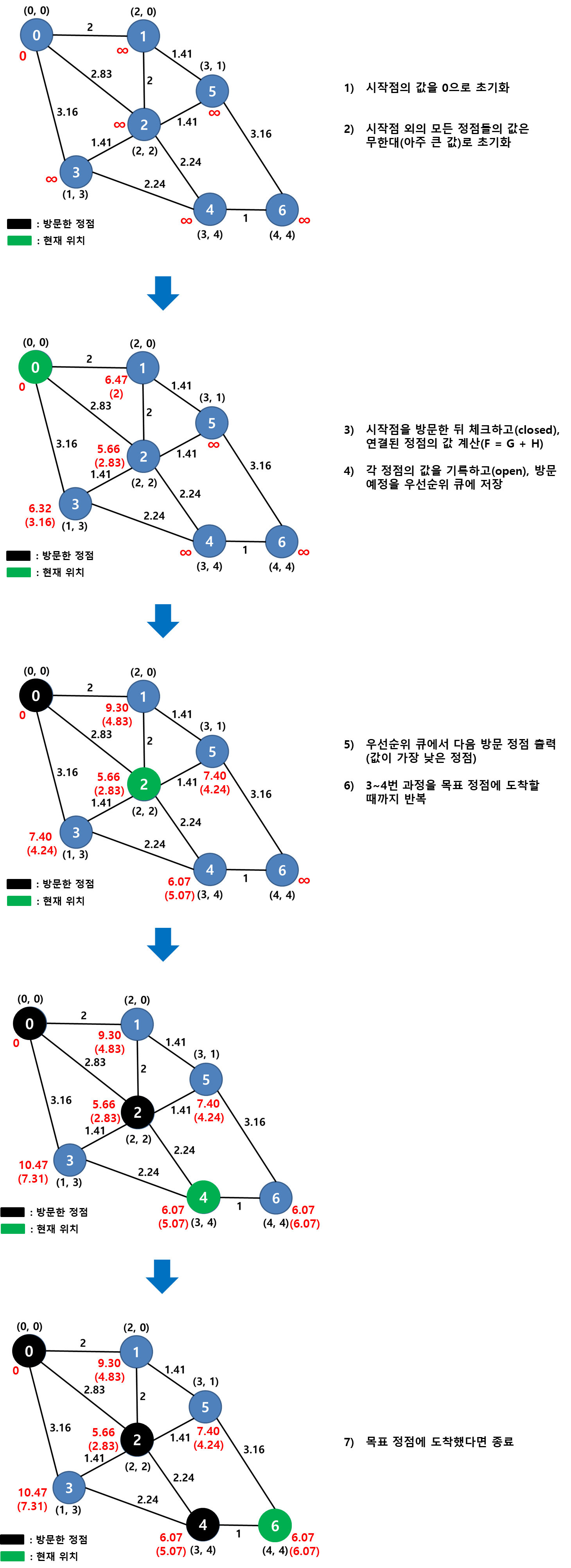 다음은 그림1의 그래프의 0번에서 출발하여 6번 정점까지 가는 경로를 A* 알고리즘으로 구하는 과정을 도식화한 것입니다.