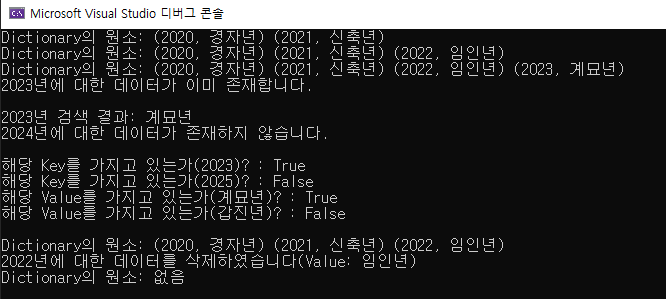 두번째 매개변수로 out 키워드를 사용하면 좀 더 확실하게 결과를 확인할 수 있습니다. 이 버전의 Remove() 함수는 Key 값이 존재할 경우 true를 반환하고 out 변수를 통해 삭제되는 Value값을 전달하며, 아니라면 false를 반환합니다. 상기 코드에서는 조건식 안에 넣어 Key 값이 존재한다면 삭제되는 Value값을 함께 출력하고, 없을 경우 출력할 문구를 따로 설정하였습니다.