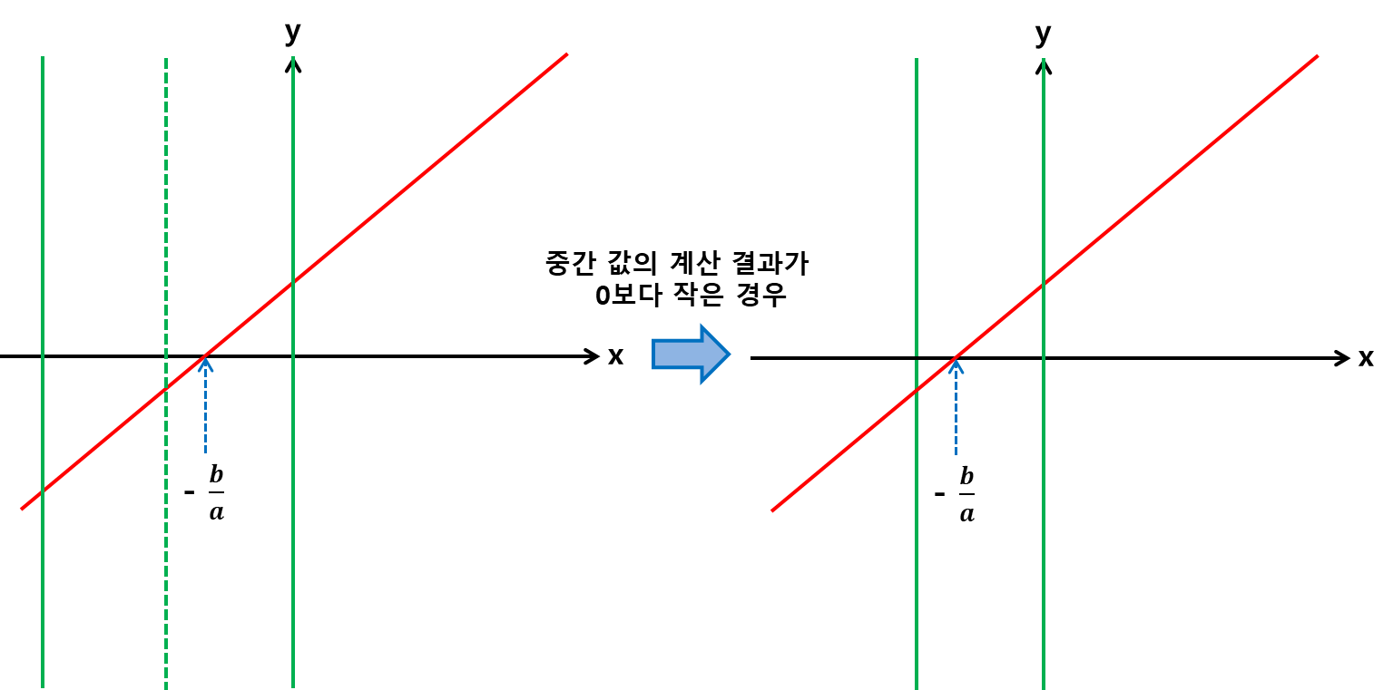 이제 폐구간의 중간값을 함수에 넣어 해를 만족하는지 검사합니다. 그림 2처럼 계산 결과가 0보다 작다면 해가 중간값보다 큰 값이라는 뜻이므로, 폐구간의 최솟값을 방금 검사한 중간값으로 변경합니다. 그림 3처럼 계산 결과가 0보다 크다면 해가 중간값보다 작은 값이라는 뜻이므로, 폐구간의 최대값을 방금 검사한 중간값으로 변경합니다. 해당 과정을 반복하면 매 검사 후 폐구간의 크기가 절반으로 줄어들게 되고, 결국 해를 발견하게 됩니다.