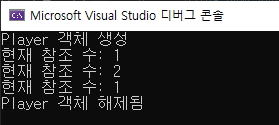 위 예시에서는 Test1()에서 Player 객체를 make_shared()를 통해 동적 할당하며 shared_ptr에 연결하고, Test2()의 매개변수로 사용하고 있습니다. 공유 포인터의 현재 레퍼런스 카운트는 use_count()를 통해 확인할 수 있습니다. Test1()에서 생성한 직후에는 1이며, Test2()에서는 p가 매개변수로 복사되어 사용되었으므로 2가 된 것을 볼 수 있습니다. Test2() 종료 후에는 복사된 포인터가 1이 되며, Test1() 종료 후 레퍼런스 카운트가 0이 되고, 자동으로 해제되어 소멸자가 호출된 것을 볼 수 있습니다.