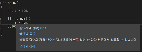 다음과 같이 람다식 외부의 변수를 별도의 캡쳐 선언 없이 사용하려고 하면 컴파일 에러가 발생합니다. 이를 해결하려면 다음 예시와 같이 캡쳐 구문을 사용해야 합니다.